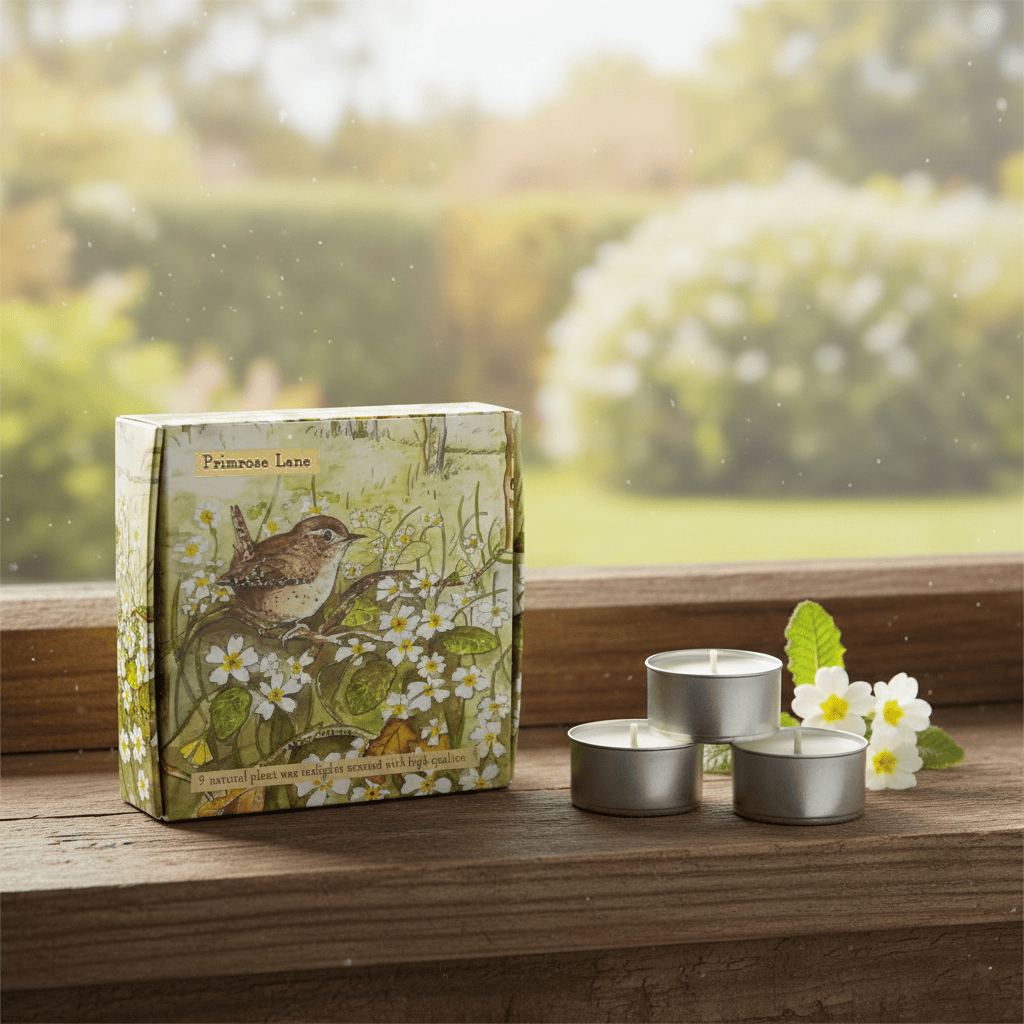 These premium quality tealights have been hand-poured into aluminium cups. Made with a unique, natural wax blend and high quality perfume oils, this product is both sustainable and kind to the environment. This set of 9 also comes in its own beautifully illustrated box with a beautiful design of a wren surrounded by primroses, sure to charm any nature lover and perfect for gifting.