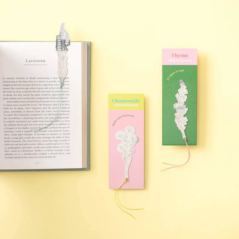 This Chamomile Herb Bouquet Bookmark is etched in steel with daisy-like details, complete with a colourful lime green cord. Place it in your book and drape the cord over a page to mark your place.