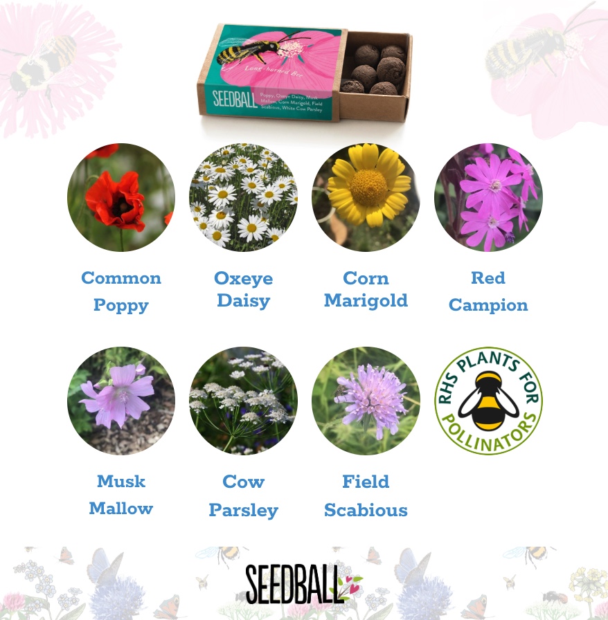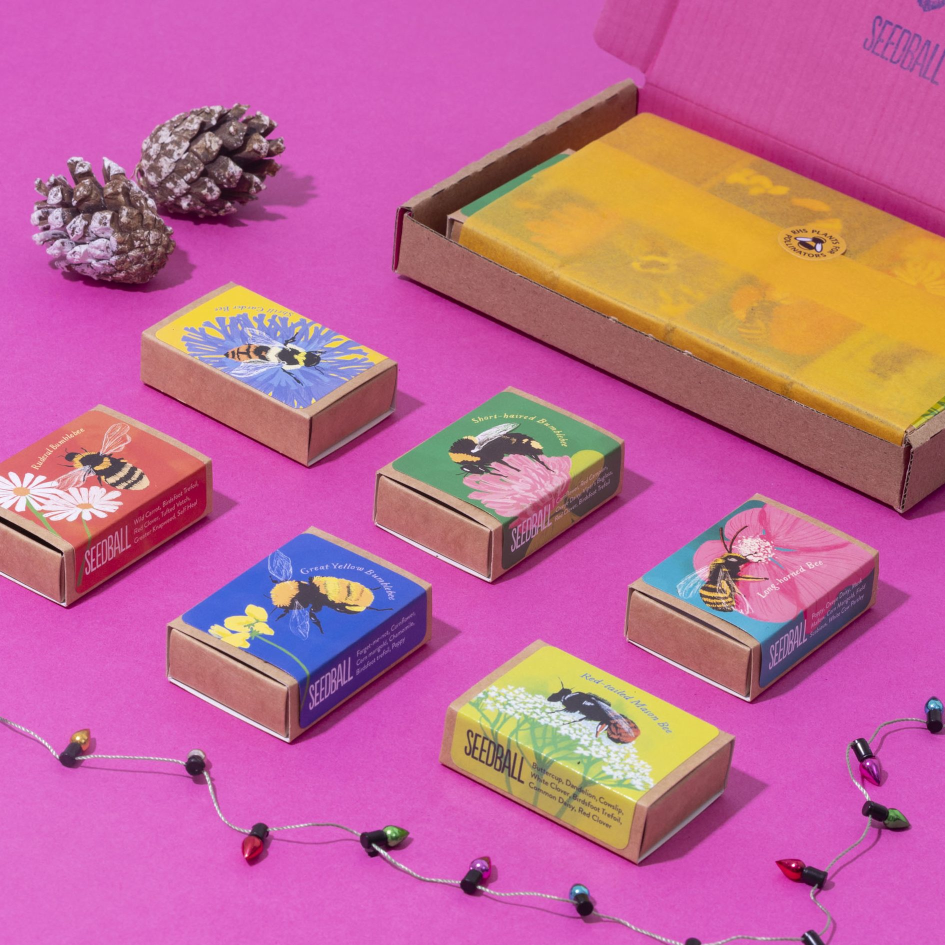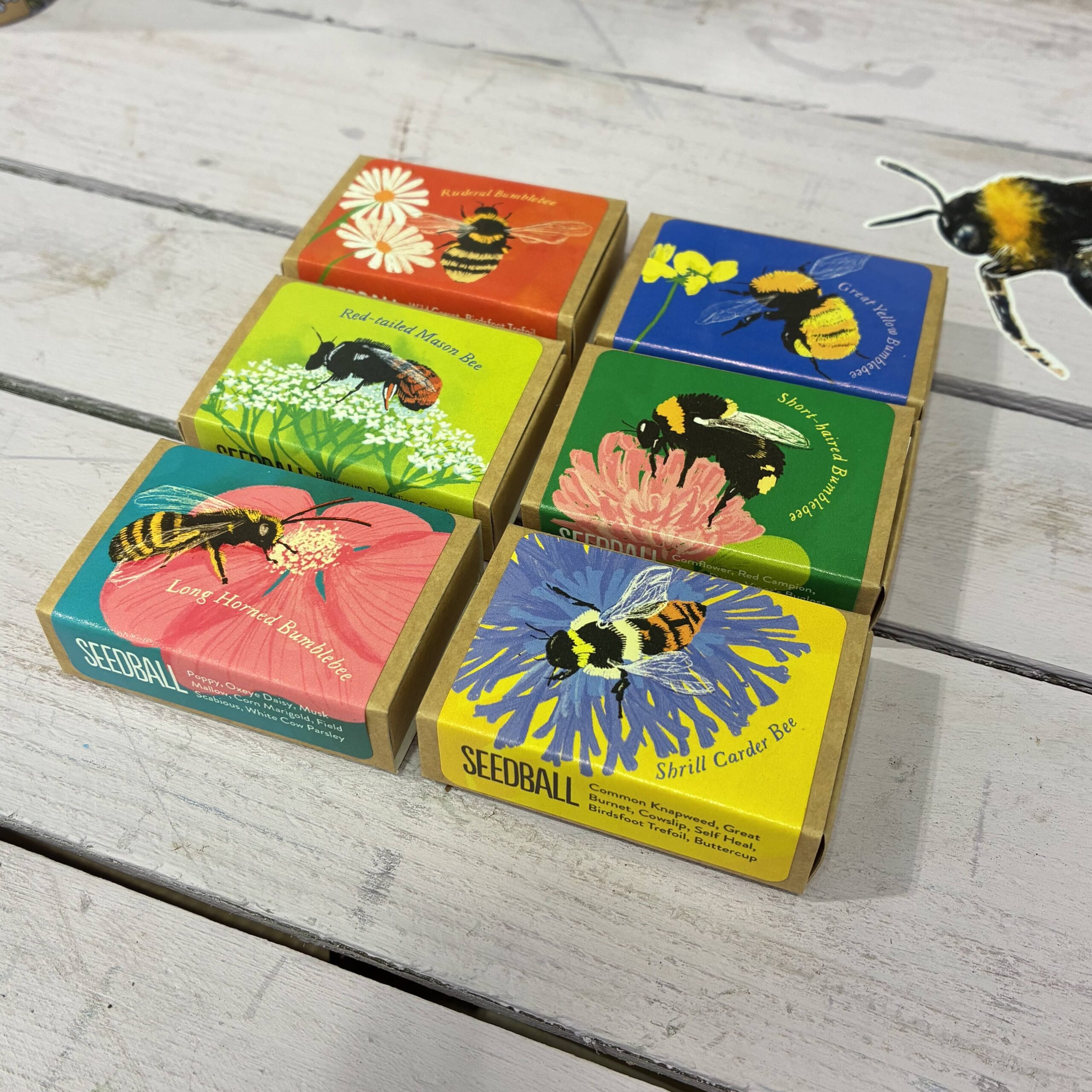 A set of 6 beautifully illustrated seed boxes from Seedball each containing a mix of seeds to support bees in your garden. Each box highlights a different British bee species with a unique seed mix to match. Each box (made from 100% recycled card) contains 6 seed balls, plus a little card insert to explain what the balls are and how to use them.